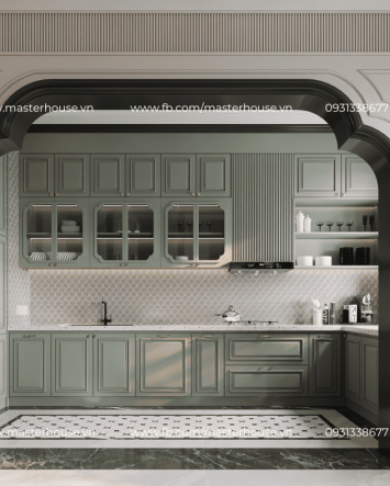 - Tủ bếp gỗ với những đường nét hoa văn tinh xảo.