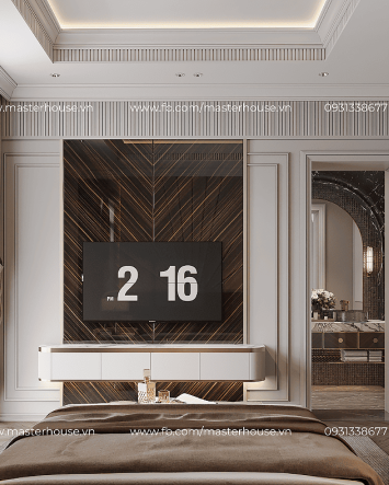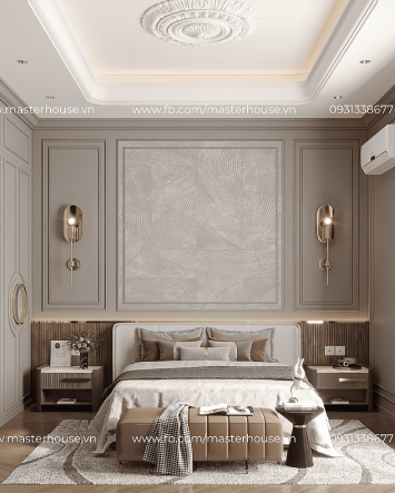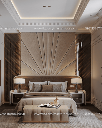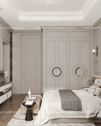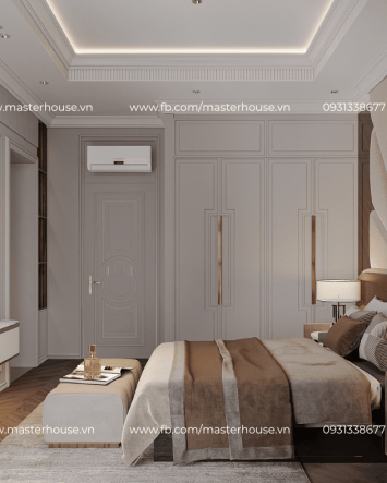 Phòng ngủ master được thiết kế với tông màu trầm ấm, tạo cảm giác thư thái và yên bình. Giường ngủ lớn được đặt cạnh cửa sổ lớn, giúp bạn tận hưởng ánh nắng tự nhiên và không khí trong lành.