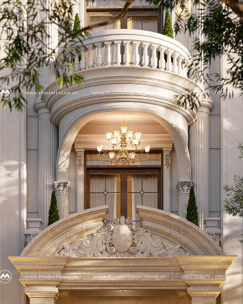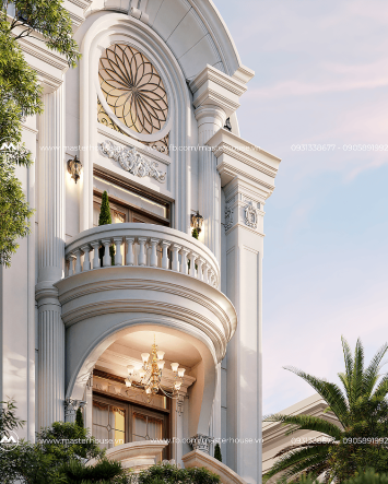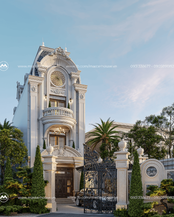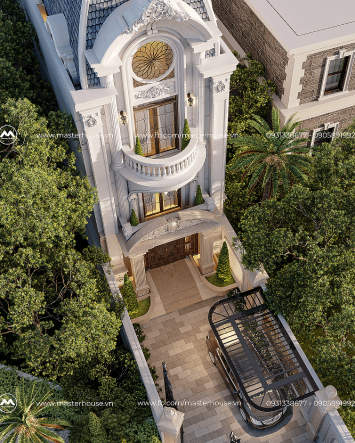 Château Blanc gây ấn tượng mạnh với kiến trúc ngoại thất lấy cảm hứng từ những lâu đài cổ kính châu Âu. Cánh cổng sắt mỹ thuật với những hoa văn tinh xảo như một lời chào đón nồng nhiệt, mở ra một không gian sống đẳng cấp. Hệ thống cột Doric cổ điển nâng đỡ mái nhà, tạo nên vẻ đẹp bề thế và vững chắc cho ngôi nhà. Mỗi cột trụ như một tác phẩm điêu khắc tinh xảo, góp phần tôn lên vẻ đẹp của kiến trúc. Những ô cửa sổ lớn bằng gỗ tự nhiên được trang trí bằng những đường kẻ chỉ tinh tế, mang đến ánh sáng tự nhiên và tầm nhìn thoáng đãng. Các ban công rộng rãi được trang trí bằng lan can sắt hoa văn, tạo điểm nhấn cho mặt tiền. Mái nhà được thiết kế theo phong cách Pháp cổ điển, với những đường nét uốn lượn mềm mại và hệ thống mái vòm tinh xảo. Mái nhà không chỉ có chức năng che chắn mà còn tạo nên vẻ đẹp uy nghi cho ngôi nhà.