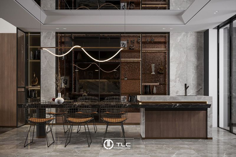 Vật liệu cao cấp: Sử dụng gỗ tự nhiên, đá marble, kính cường lực, kim loại mạ vàng để tăng tính sang trọng.