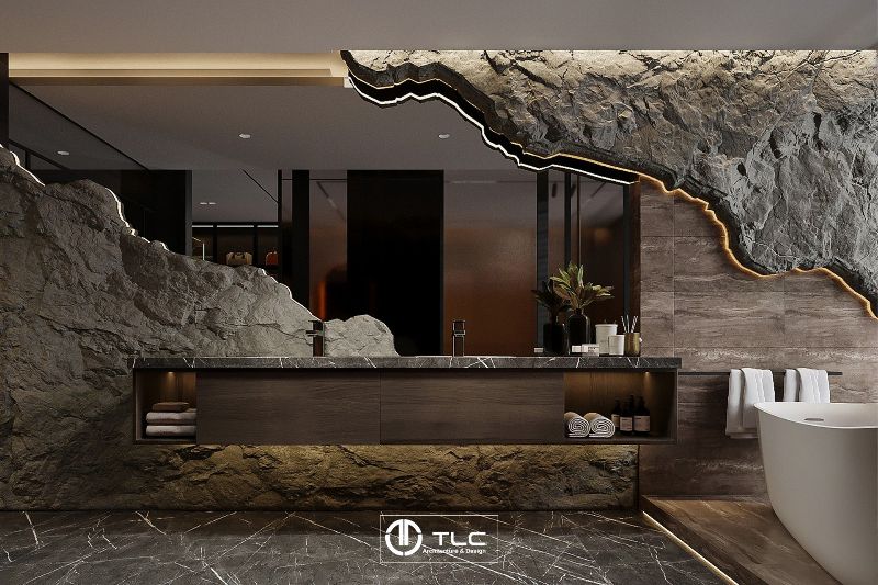 Tường ốp đá tự nhiên hoặc gỗ công nghiệp cao cấp.